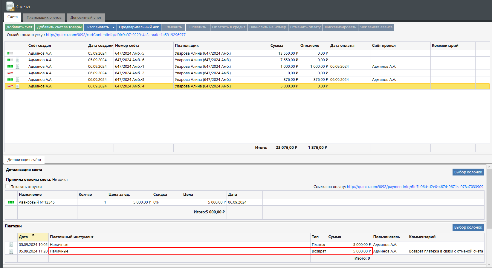 При полной либо частичной отмене счета сначала производится возврат средств, а затем – перенос средств на баланс сертификата. В детализации счета добавляются транзакции возврата средств, а также транзакция переноса баланса с указанием в комментарии, на баланс какого сертификата были перенесены денежные средства: