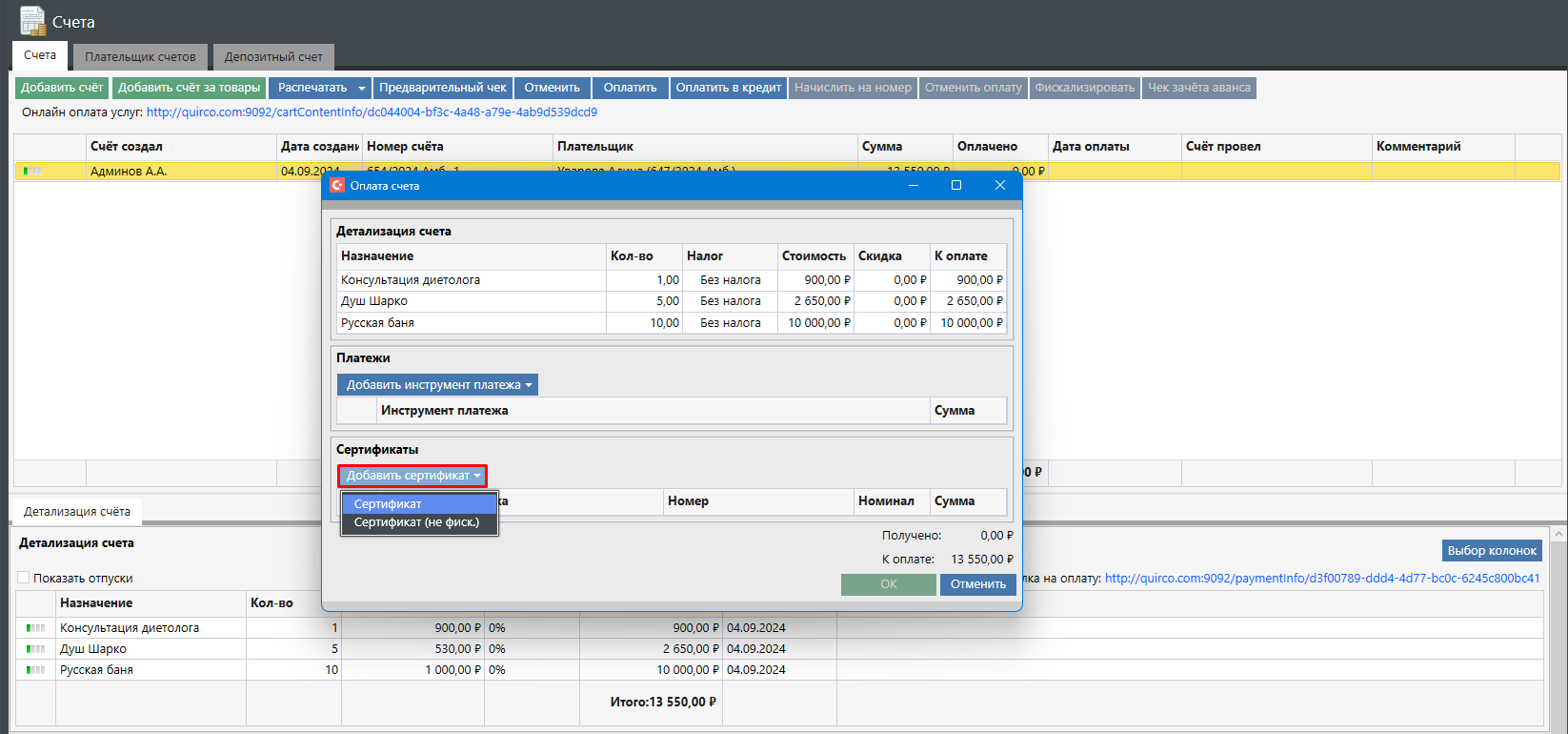 Нажать кнопку «Добавить счет за товары» и в счете добавить необходимый сертификат. Все товары с типом «Сертификат» после добавления в счет отобразятся в отдельном разделе: