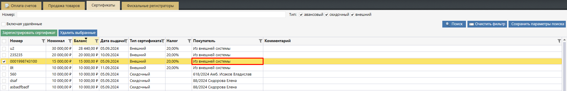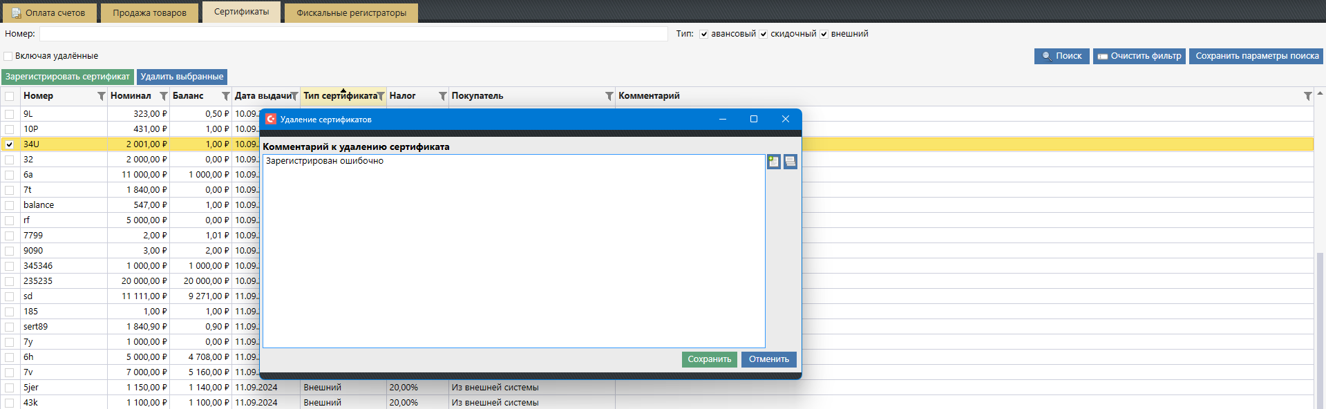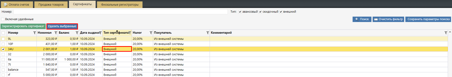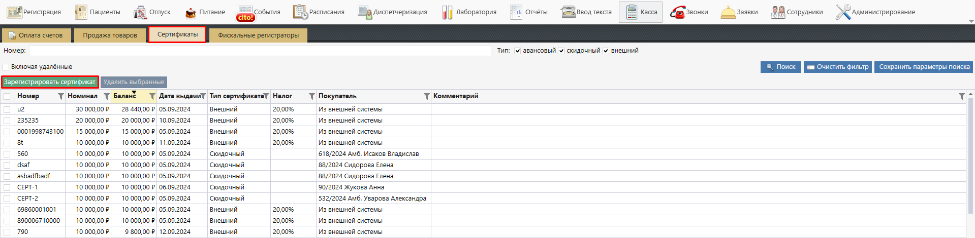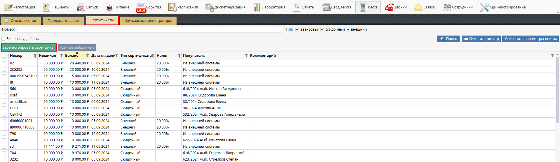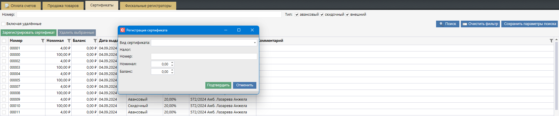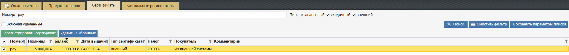из модуля «Касса» на вкладке «Сертификаты».