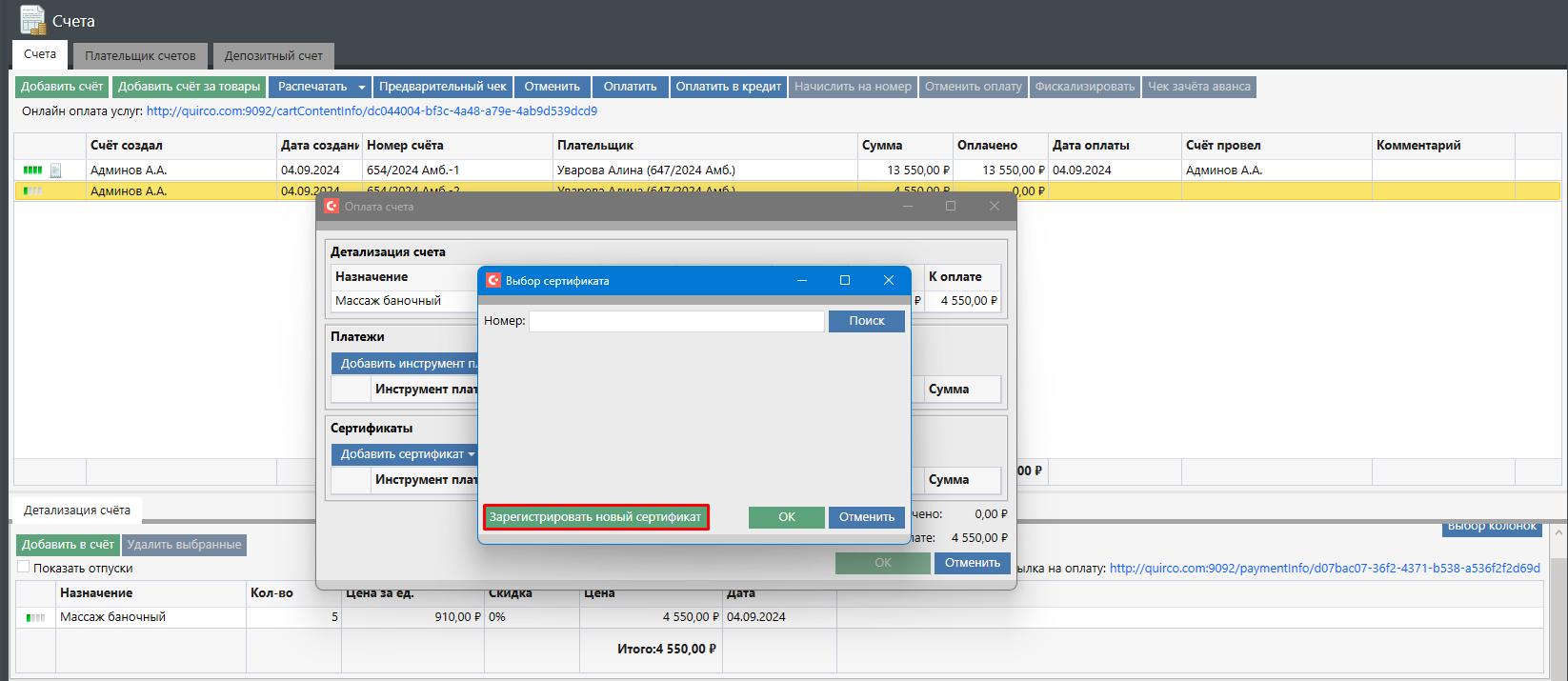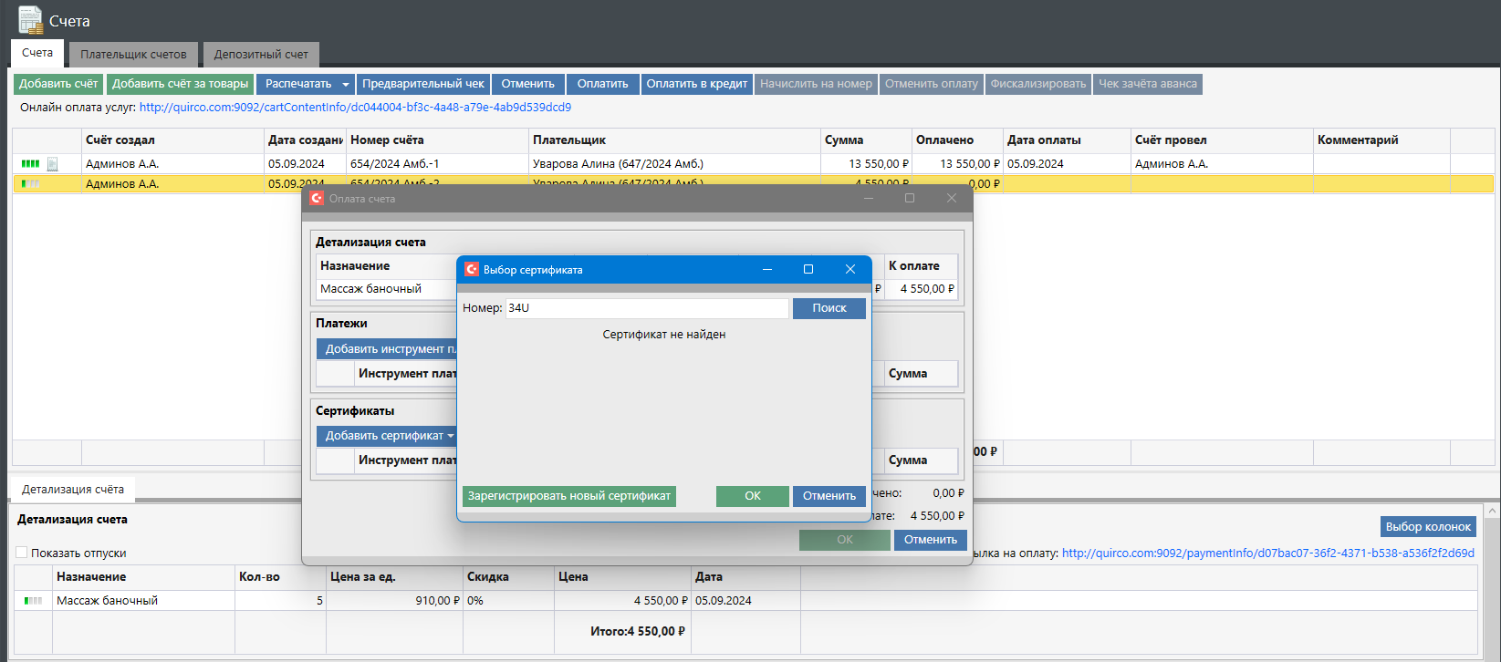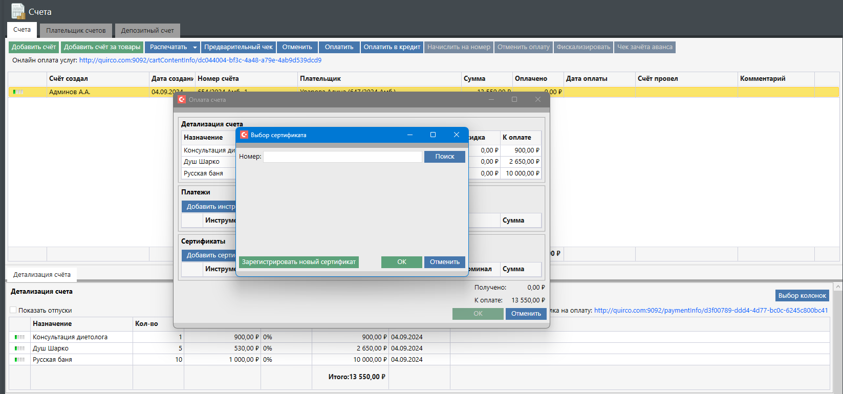 При выборе платежного инструмента отобразится диалоговое окно, в котором можно выполнить поиск сертификата по номеру или зарегистрировать новый сертификат в случае, если его продажа ранее осуществлялась не в Санаториуме: