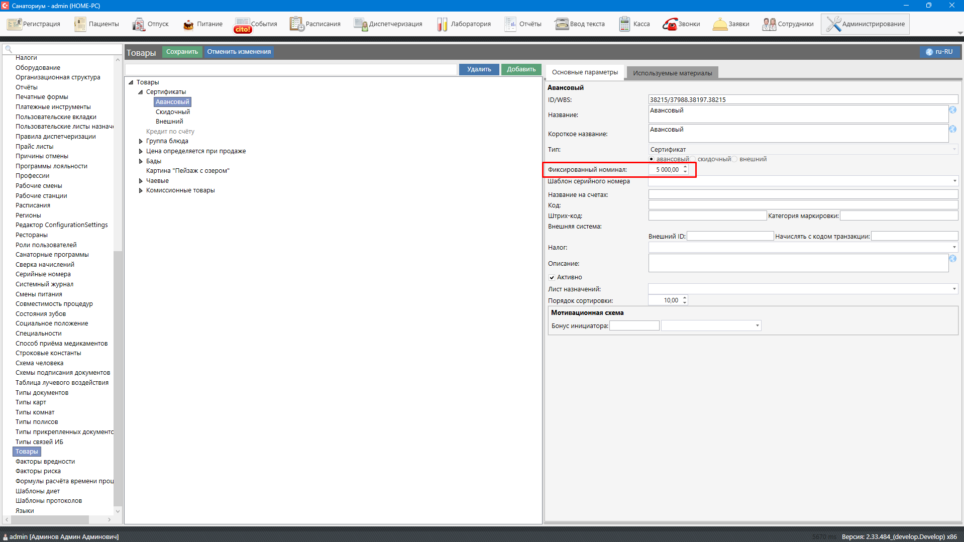 В модуле «Администрирование» необходимо перейти в справочник «Товары» и создать новый товар. Для выделения сертификатов в отдельную группу товаров используется тип товара «Сертификат»: