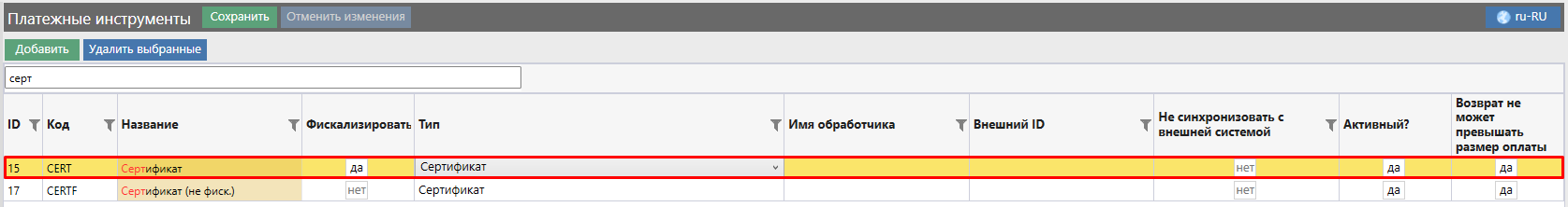 В справочнике «Платежные инструменты» необходимо добавить активный фискализируемый платежный инструмент с типом «Сертификат». Параметр «Возврат не может превышать размер оплаты» также должен быть включен: