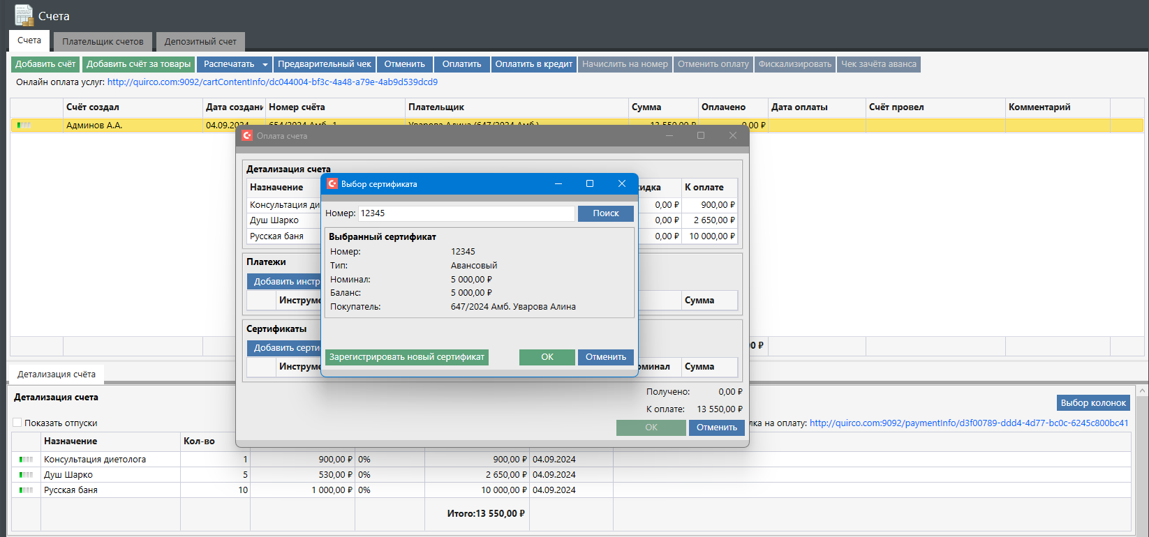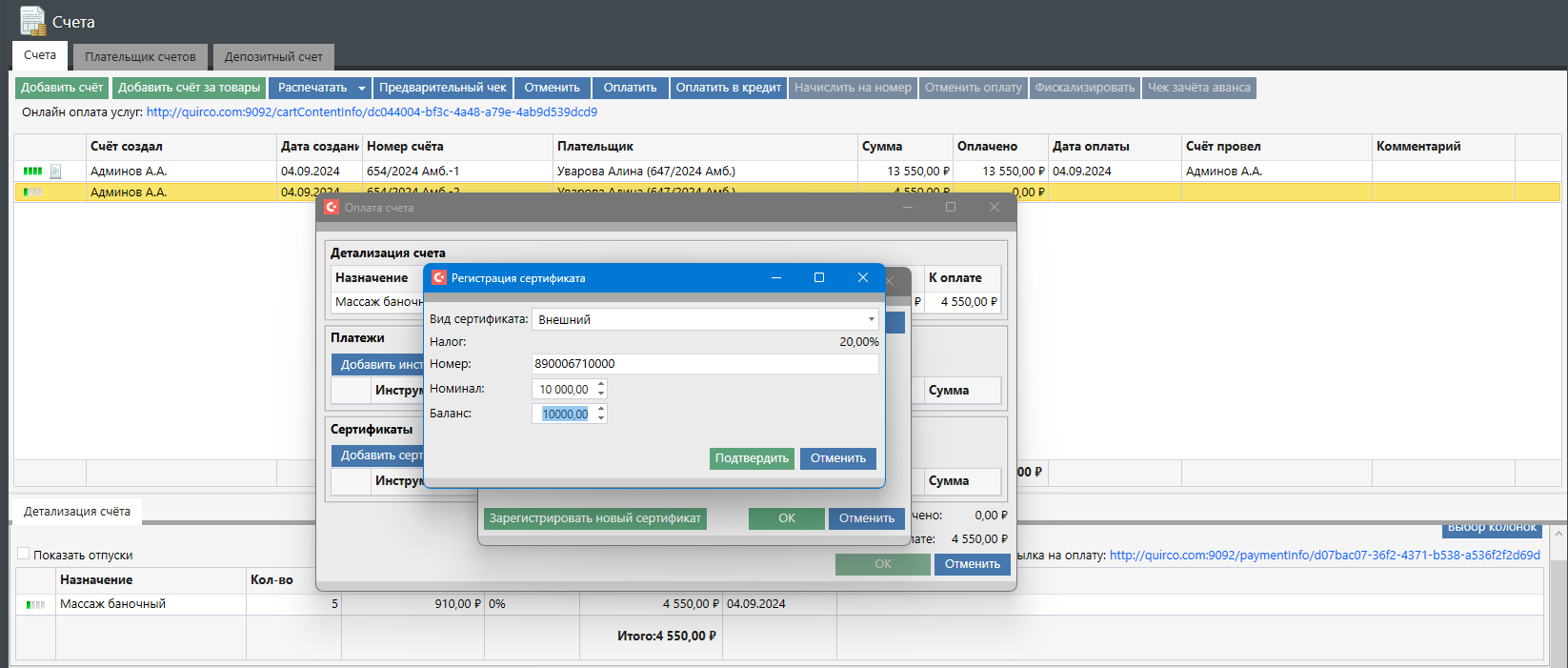 Далее нужно нажать кнопку «Ок». В карте будет создан счет, в детализации которого будет отображаться номер проданного сертификата: