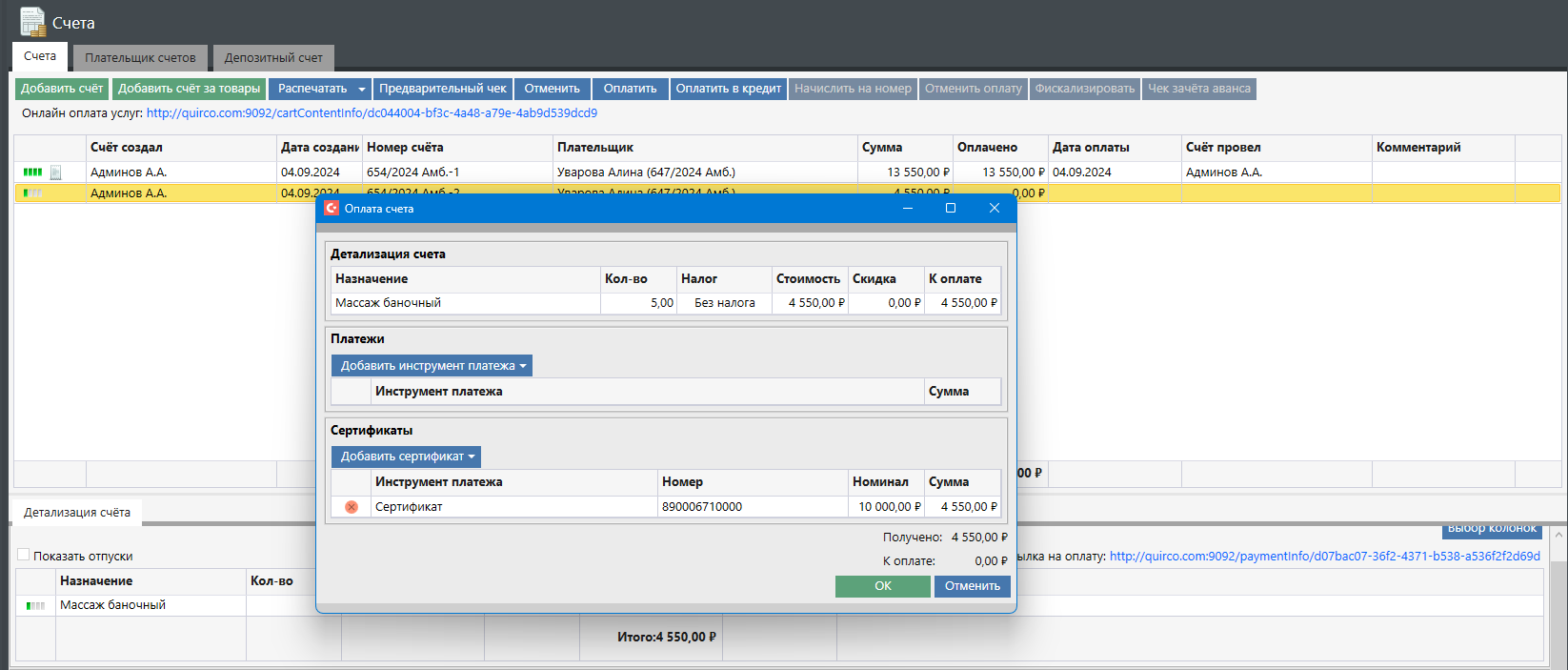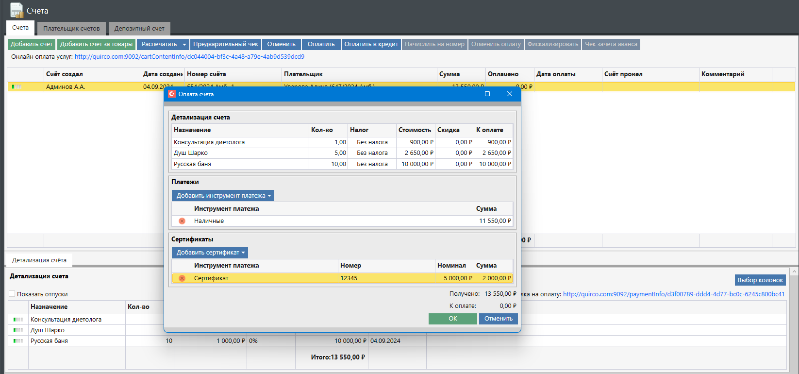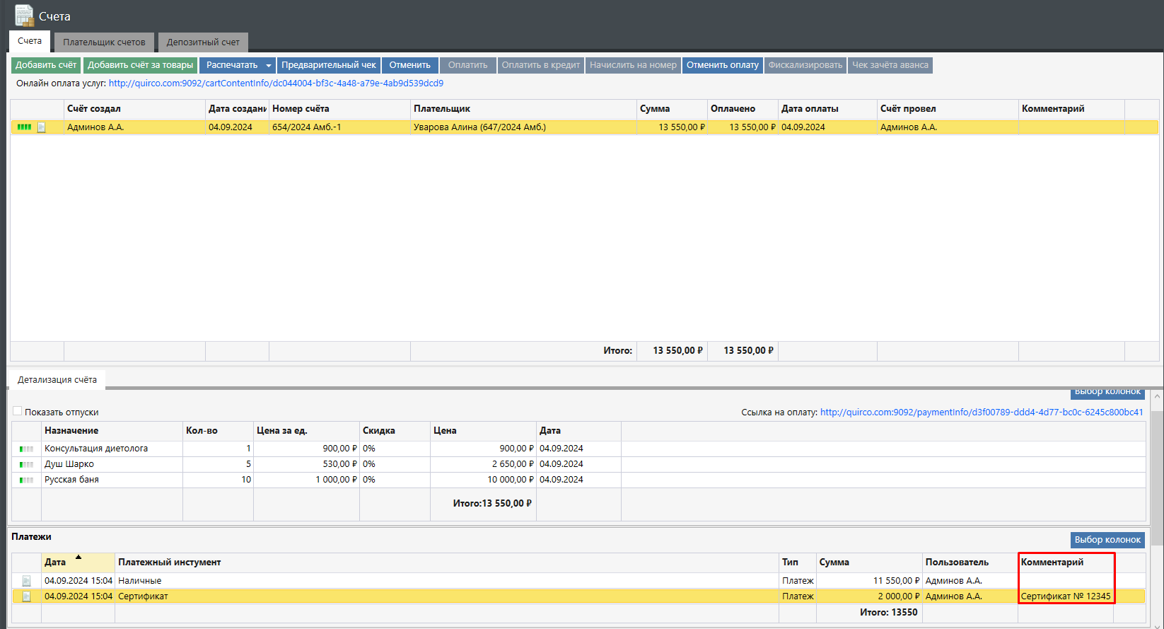 Далее необходимо нажать кнопку «ОК» и завершить процедуру оплаты счета. В комментарии будет доступна информация о номере сертификата, с использованием которого производилась оплата: