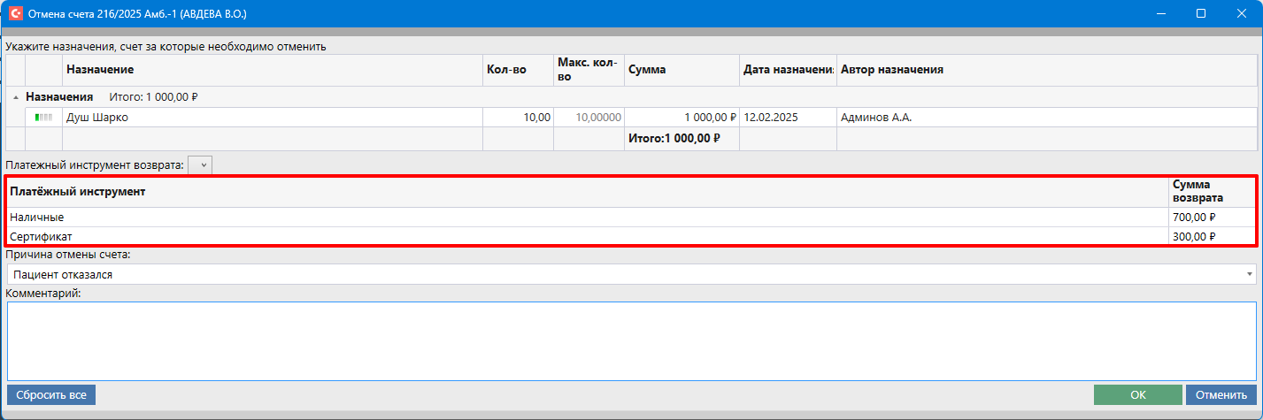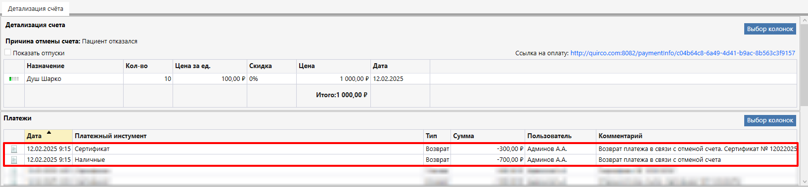 В случае, если счёт был оплачен несколькими платёжными инструментами, например, сертификатом и наличными, то возврат будет по умолчанию осуществляться такими же платёжными инструментами: