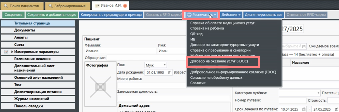 Выбираем в меню «Распечатать» нужный документ и Санаториум формирует его в окне предпросмотра, после чего нажимаем кнопку «Отправить в F.Doc»