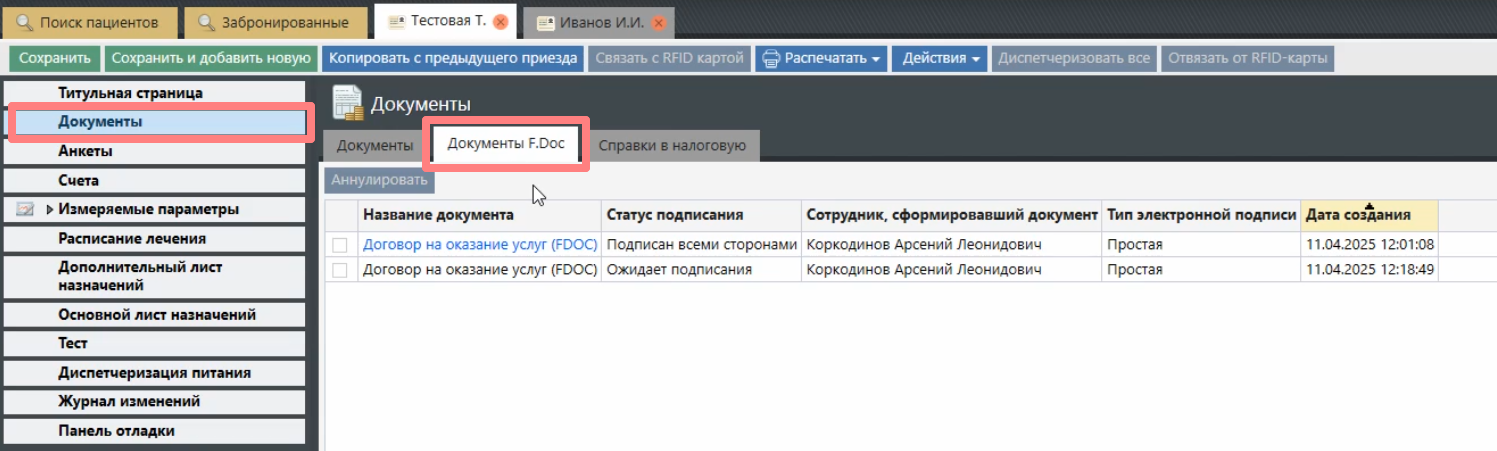 До момента подписания пациентом документ можно аннулировать. Для этого у пользователя должно быть право "Управление документами F.Doc". Документ помечается в базе МИС Санаториум как аннулированный и исчезает из списка на вкладке.