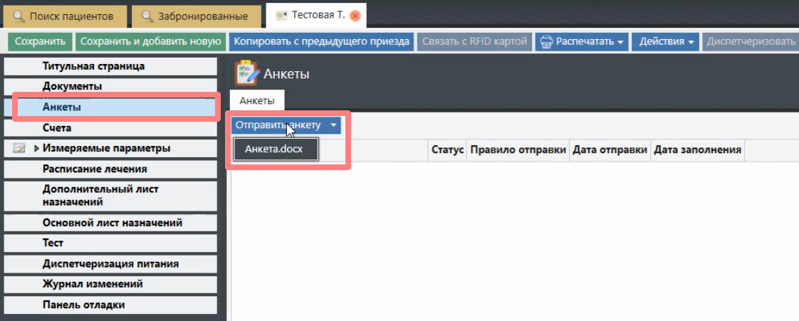 - Вручную анкета отправляется из раздела "Анкеты" в карте пациента.
