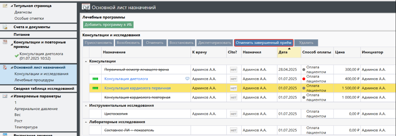 На основном листе назначений есть возможность отменить и восстановить завершенный прием: