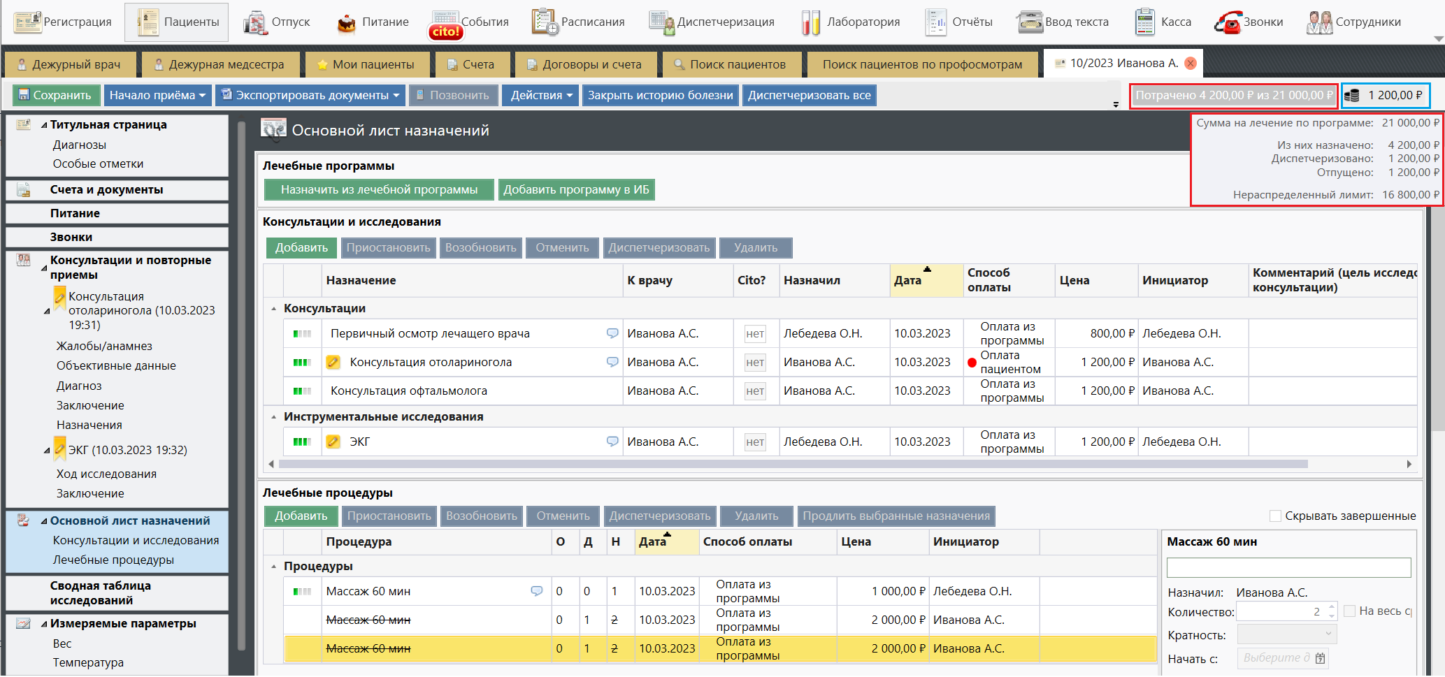 В ней врач и медицинский персонал видит всю информацию по пациенту, назначает процедуры одним кликом, диктует заключения и комментарии голосом, отслеживает результаты лабораторных и инструментальных исследований.