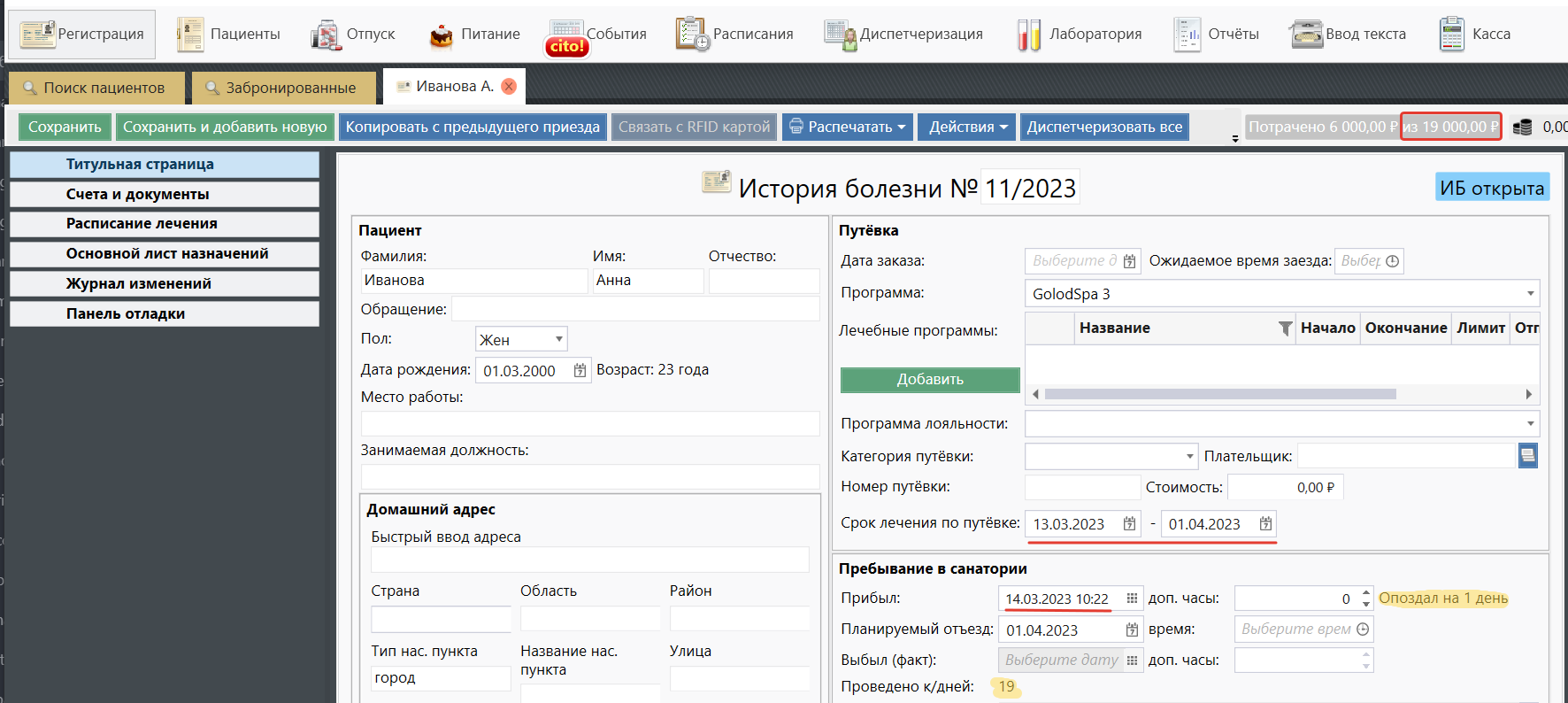 Сумма на лечение по программе = "Ежедневный расход" * количество дней пребывания (задается в настройке Санаторных программ). В данном случае 1000 руб * 21 день = 21.000 руб. При увеличении/уменьшении сроков пребывания лимит СП увеличивается/уменьшается соответственно. Также лимит уменьшается, если пациент прибыл на объект с опозданием (расчет лимита опирается на поле "Проведено к/дней").