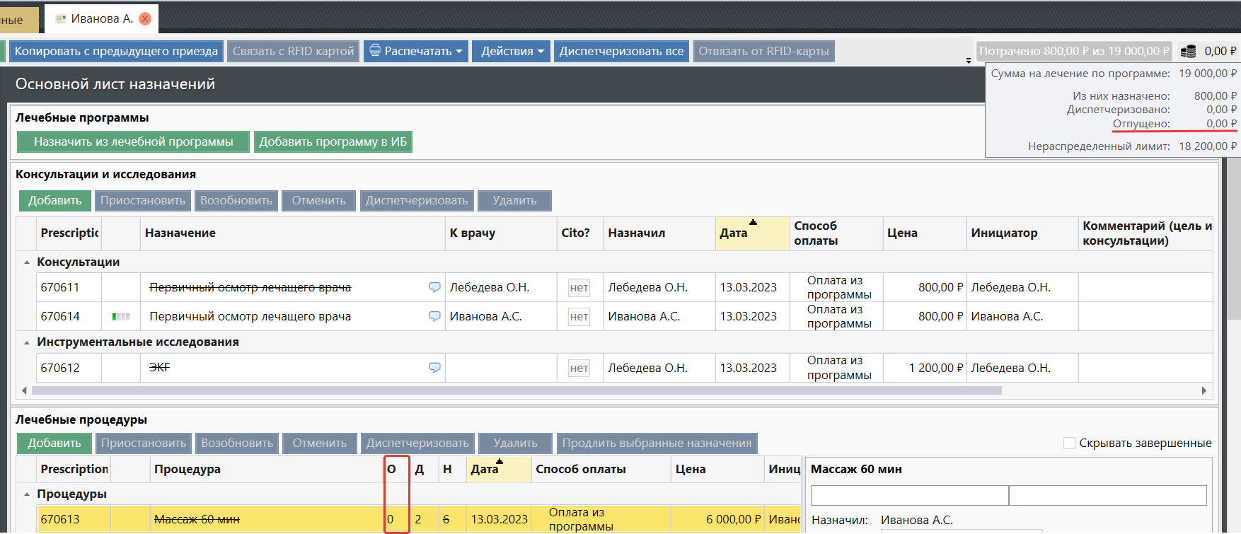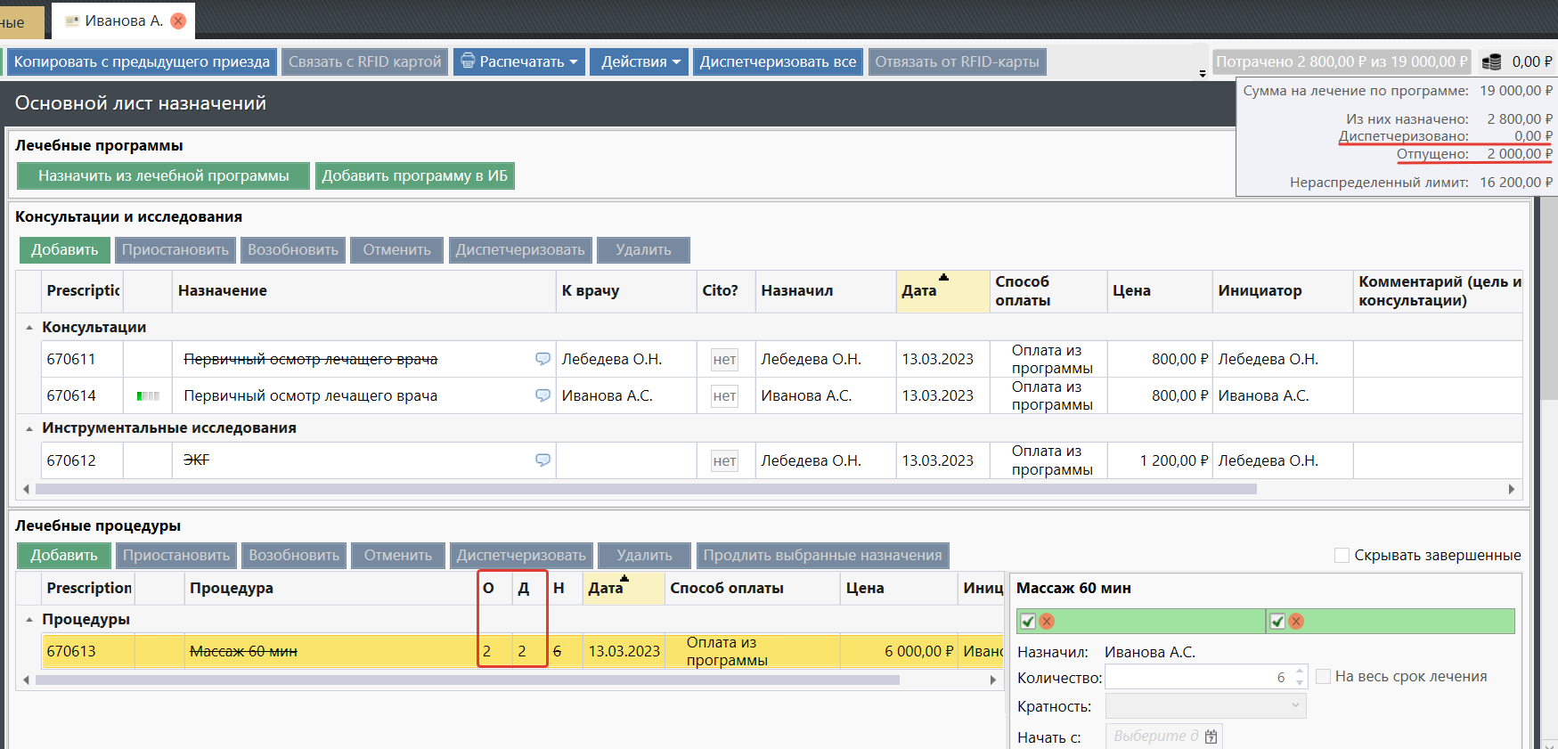 Рассмотрим пример: "Массаж 60мин" был назначен в количестве 6 шт, диспетчеризировано 3 шт, отпущено 2 шт. Но услугу отменили с помощью кнопки "Отменить".