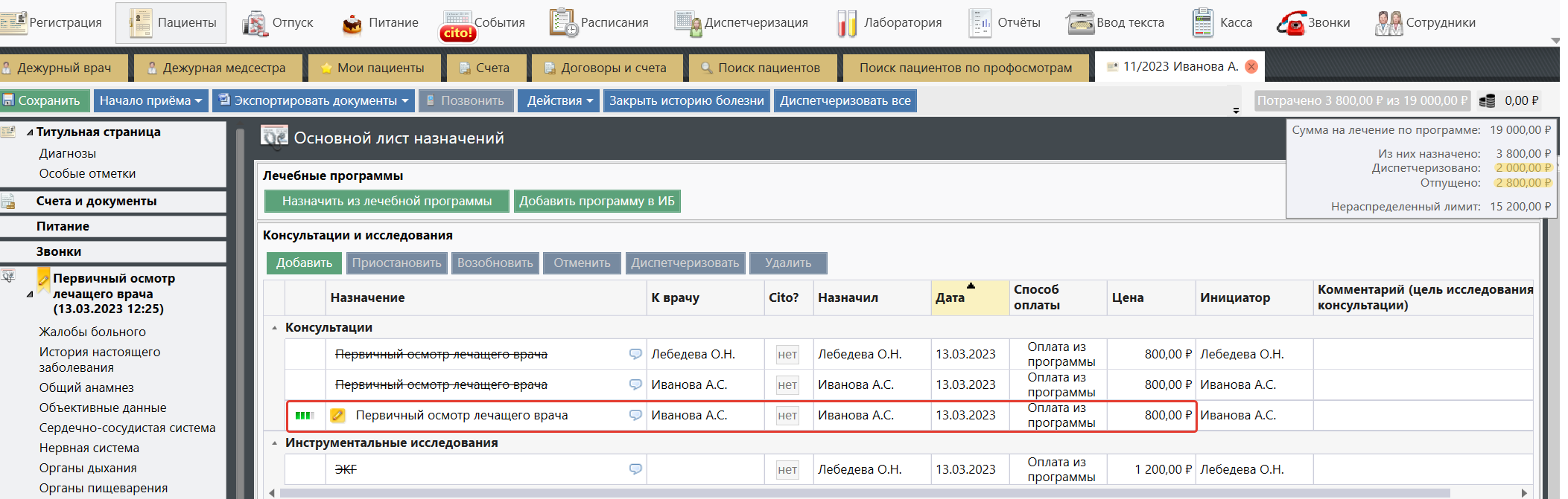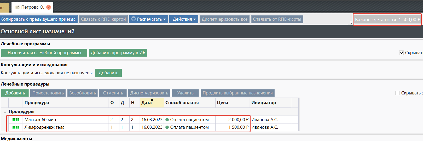 - Красным отображаются платные назначения (способ оплаты "оплата пациентом")