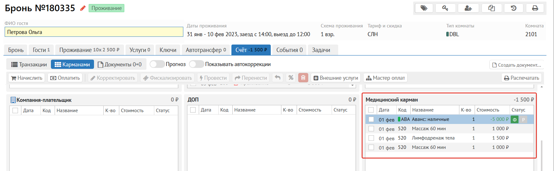 Например в Логусе начислили авансом 5000 руб, в Санаториуме назначили и отпустили услуги на 3500. Баланс гостя составляет 1500.
