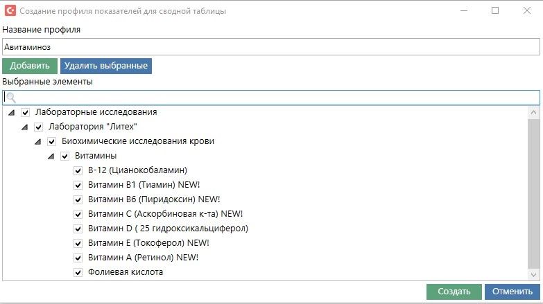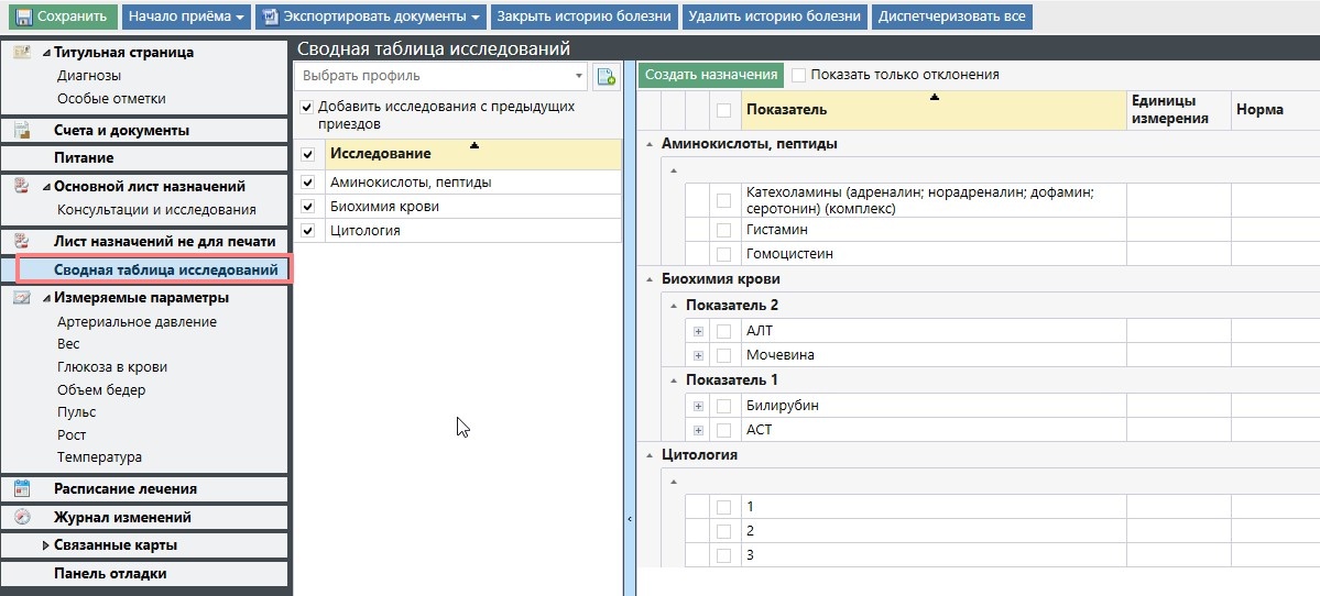 - Есть возможность создания профилей показателей для сводной таблицы. Это позволяет просмотреть набор исследований для диагностики определенных спектров заболеваний. В таблице будут отображаться как проведенные исследования, так и не проведенные, которые можно будет тут же и назначить.