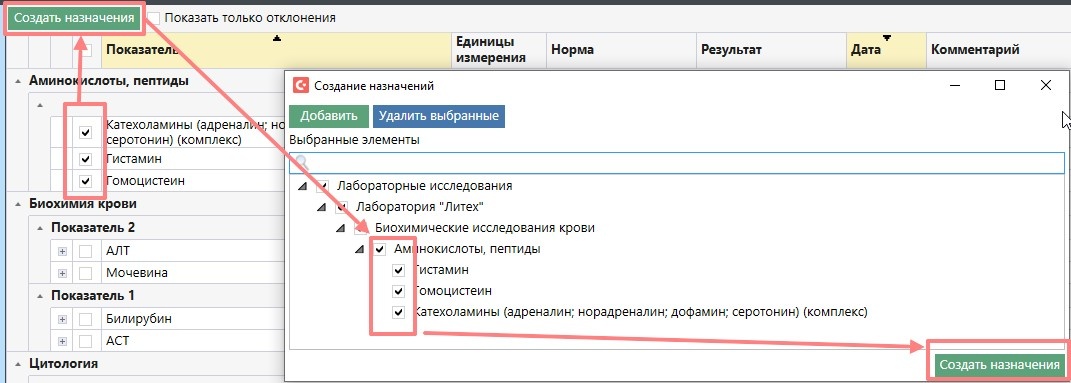 - Из таблицы с результатами исследований можно сразу создать назначения, если какие-то из анализов необходимо повторить. Для этого отметить галками в таблице нужные показатели, нажать “Создать назначение”. В открывшемся окне также отметить нужное и нажать “Создать назначения” .