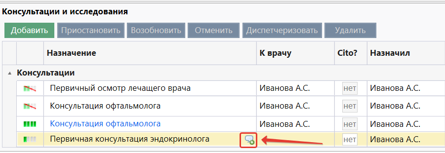 При назначении консультации из одной группы врач будет подставляться автоматически тот, который указан у первой назначенной услуги из этой группы.