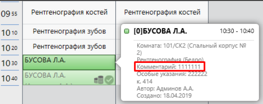 В системе есть еще один вид комментариев к назначению, который добавляется с помощью кнопки . Данный комментарий отображается в "Расписании" и "Диспетчеризации", при наведении.