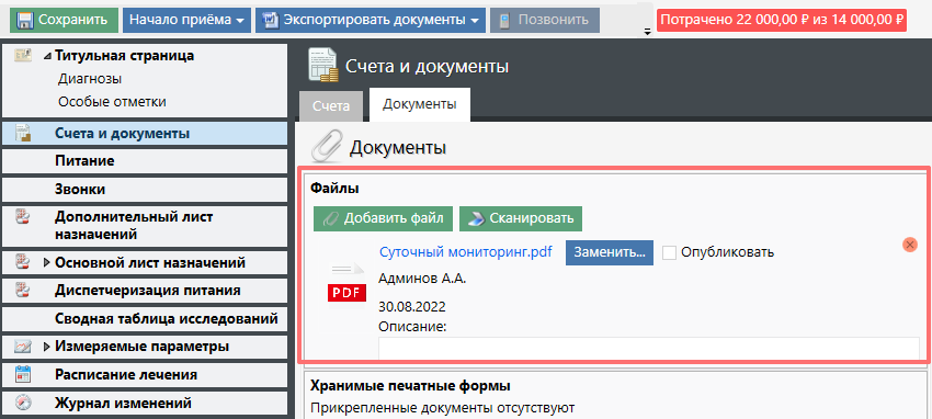 Обычно в данной секции хранится копия паспорта или другие документы удостоверяющие личность. Также это могут быть результаты обследований, направления или рекомендации врачей, которые пациент привез с собой.