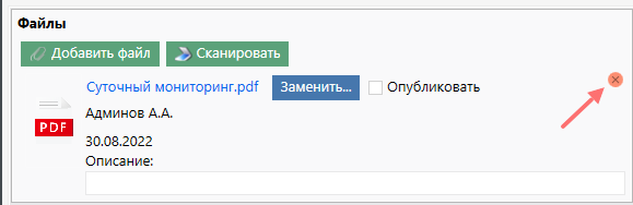 Если документ был добавлен ошибочно или больше не нужен в ИБ, то его можно удалить, нажав на крестик.