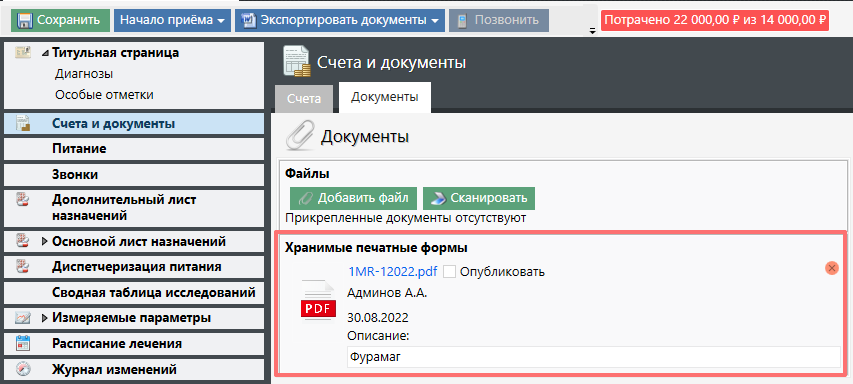 При наличии подключенного к компьютеру сканера есть возможность сканирования документов прямо из интерфейса Санаториума.