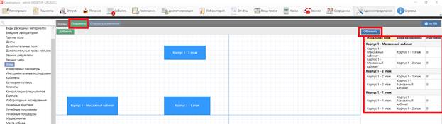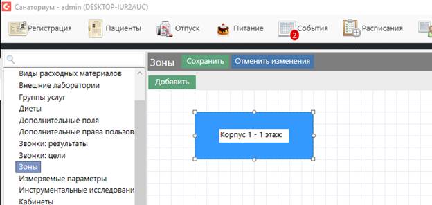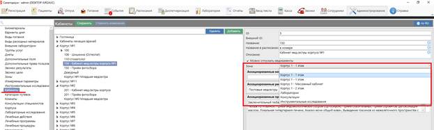 Для добавления кабинета в зону необходимо выбрать кабинет из справочника «Кабинеты» и задать зону из выпадающего списка.