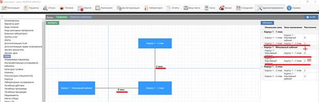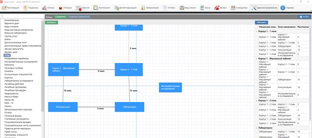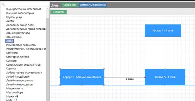 После привязки кабинетов к какой-либо из зон при диспетчеризации назначений на эти кабинеты система будет учитывать, что временной промежуток между ними не может быть меньше, чем расстояние в минутах.