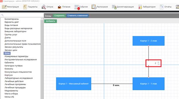 Для изменения расстояния между зонами необходимо дважды кликнуть левой кнопкой мыши на число минут возле линии связи. В появившемся поле значение можно отредактировать вручную или воспользоваться кнопками увеличения и уменьшения числа.