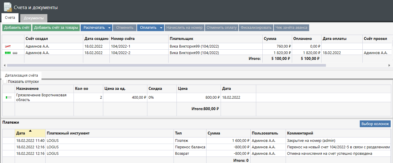 С версии 2.32 доступна частичная отмена закрытых на номер счетов (только при интеграции с Logus). Работа данного функционала аналогична частичной отмене счета, который был оплачен в системе Санаториум и доступна как с модуля "Касса", так из вкладки "Счета и документы".