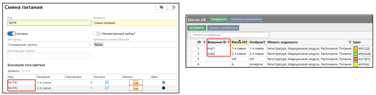 Для того, чтобы информация верно передавалась из одной системы в другую необходимо настроить "Код" в Логусе равный "Внешнему ID" в Санаториуме. На примере настройки синхронизации меток: