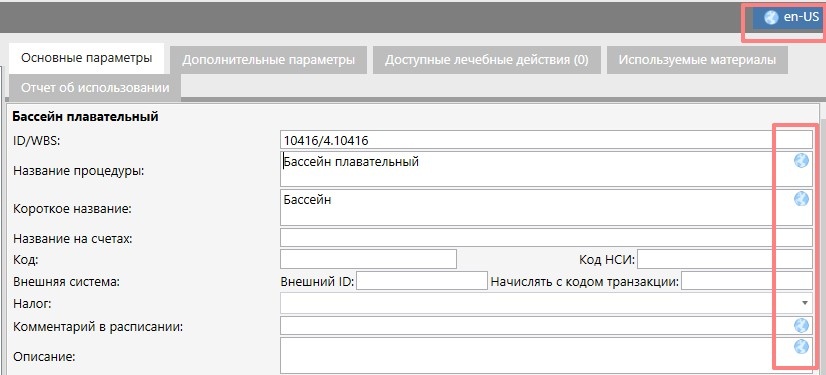 После заполнения справочника языков, в справочниках услуг для полей отмеченных значком можно будет записать данные на другом языке. Для этого нужна нажать на кнопку переключения языка, выбрать необходимый и в нужные поля вставить текст. Сохранить изменения.