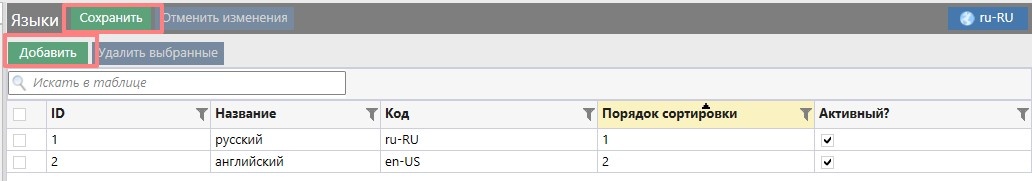 Для добавления языка нажать “Добавить”, указать название, код и порядок сортировки. Сохранить.