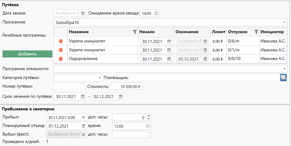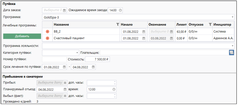 - В остальных случаях дата окончания равна дате "Планируемого отъезда", если дата планируемого отъезда не задана - то смотрим на "Срок по путевке" (в таблице Лечебных программ колонка "Окончание" будет пустая).