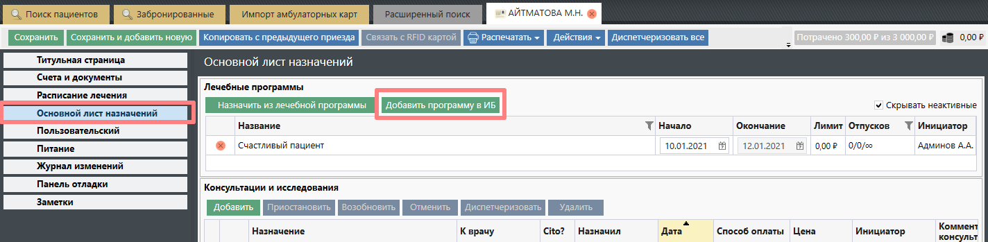 Добавить лечебную программу можно на Титульном листе, нажав "Добавить" в блоке "Лечебные программы":