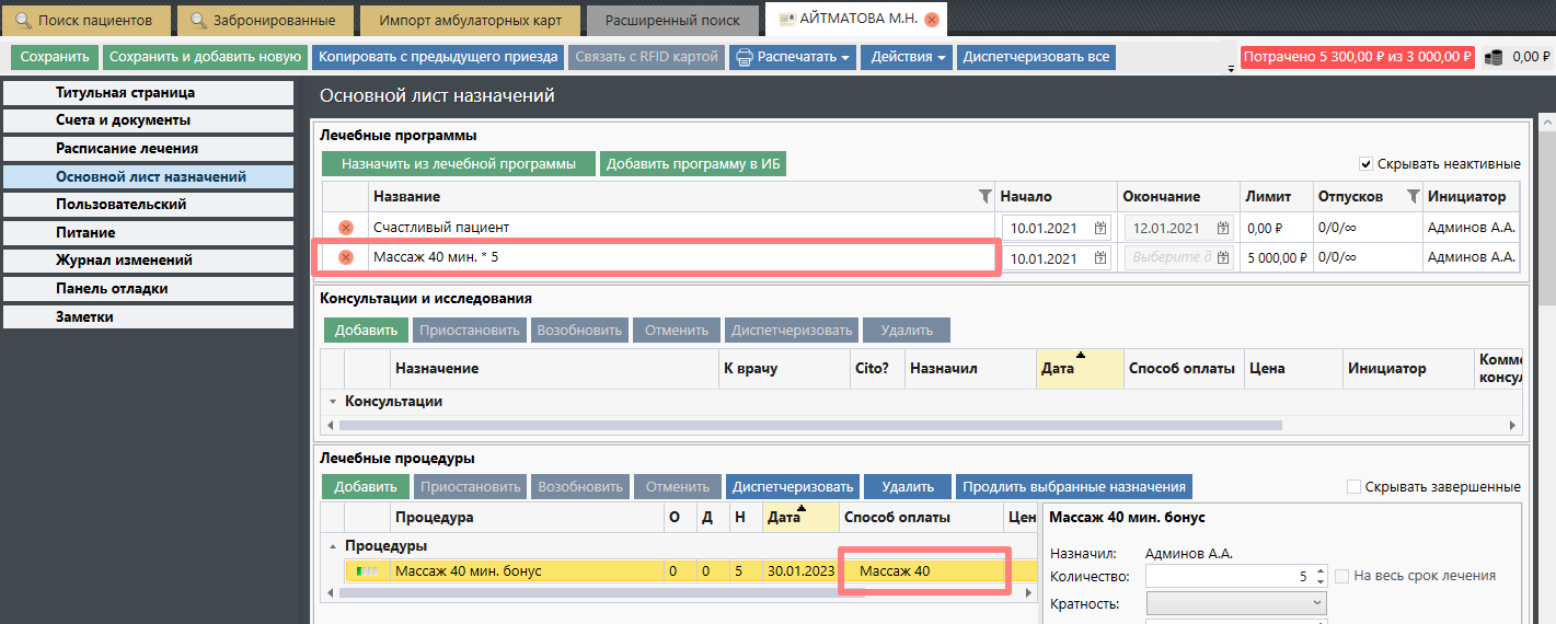 При добавлении услуги входящей в состав Лечебной программы в поле "Способ оплаты" будет указано ее краткое название:
