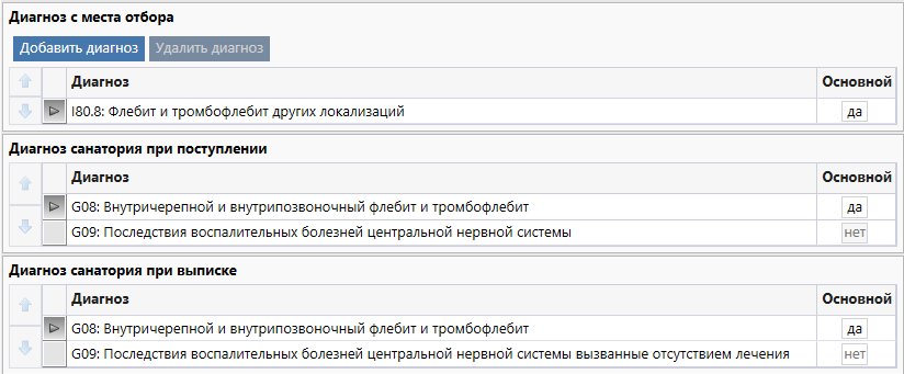 Для блоков "Диагноз санатория при поступлении" и "Диагноза санатория при выписке" могут быть разные "Основные диагнозы":