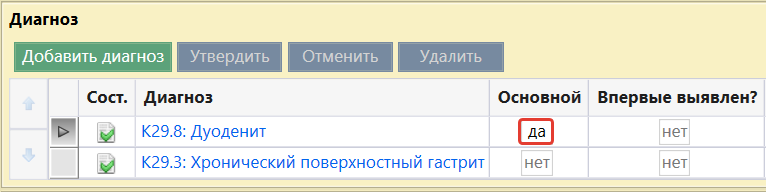 С помощью стрелок есть возможность работы с местоположением диагнозов (выше, ниже). Примечание: основной диагноз всегда будет верхним.