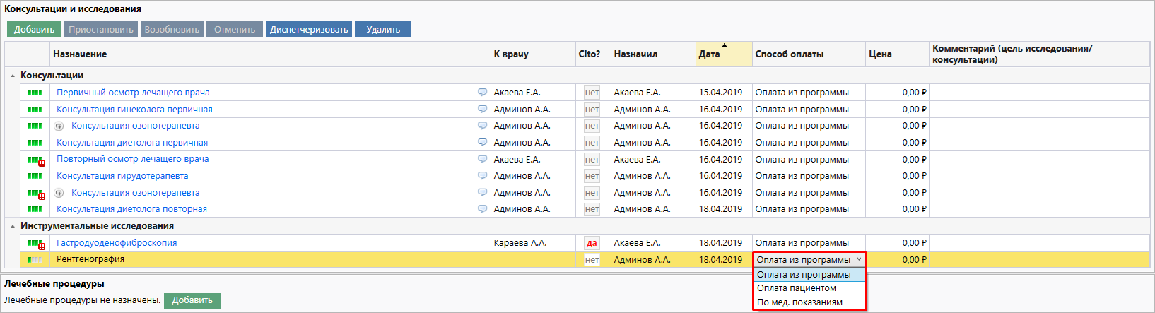 2. Оплата пациентом - означает, что на услугу можно выставить счет. После диспетчеризации такого назначения в расписании будет указано, что назначение платное.