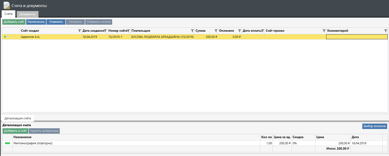 Чтобы добавить счет на услугу со способом оплаты "Оплата пациентом" необходимо открыть вкладку "Счета и документы" нажать кнопку "Добавить счет" и выбирать соответствующие услуги. Далее появляется возможность печати и оплаты счета.