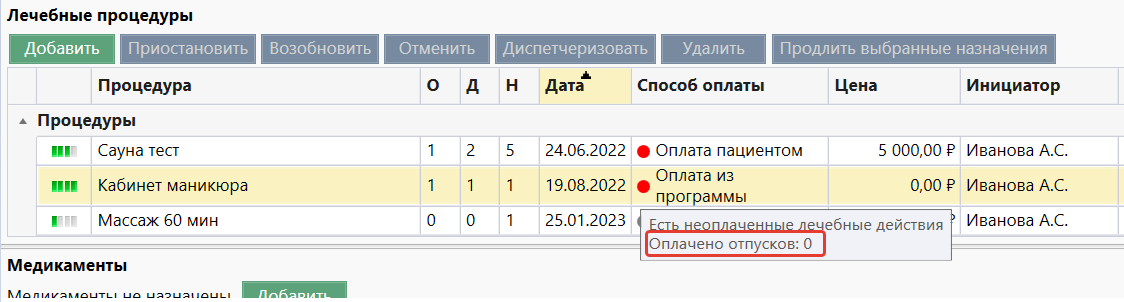 - Если услуга имеет способ оплаты "Оплата из программы" или "По мед. показаниям", то после отпуска услуги с ЛД индикатор не будет отображаться.