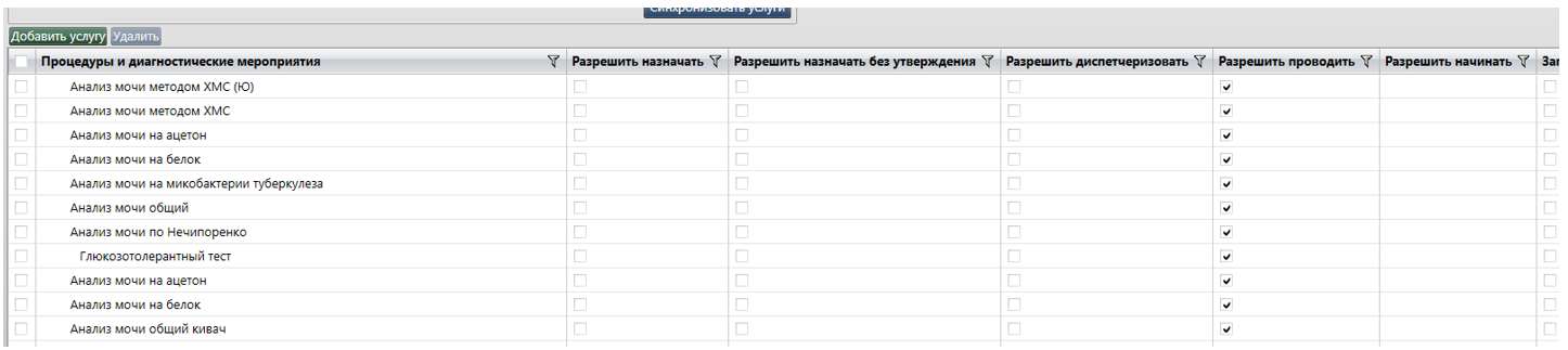 - Проведение процедур и диагностических мероприятий: Нажать на кнопку "Добавить услугу". В открывшемся диалоговом окне выбрать нужное исследование, консультацию или процедуру. Отметить "галочками" то, что пользователю разрешается или запрещается делать.