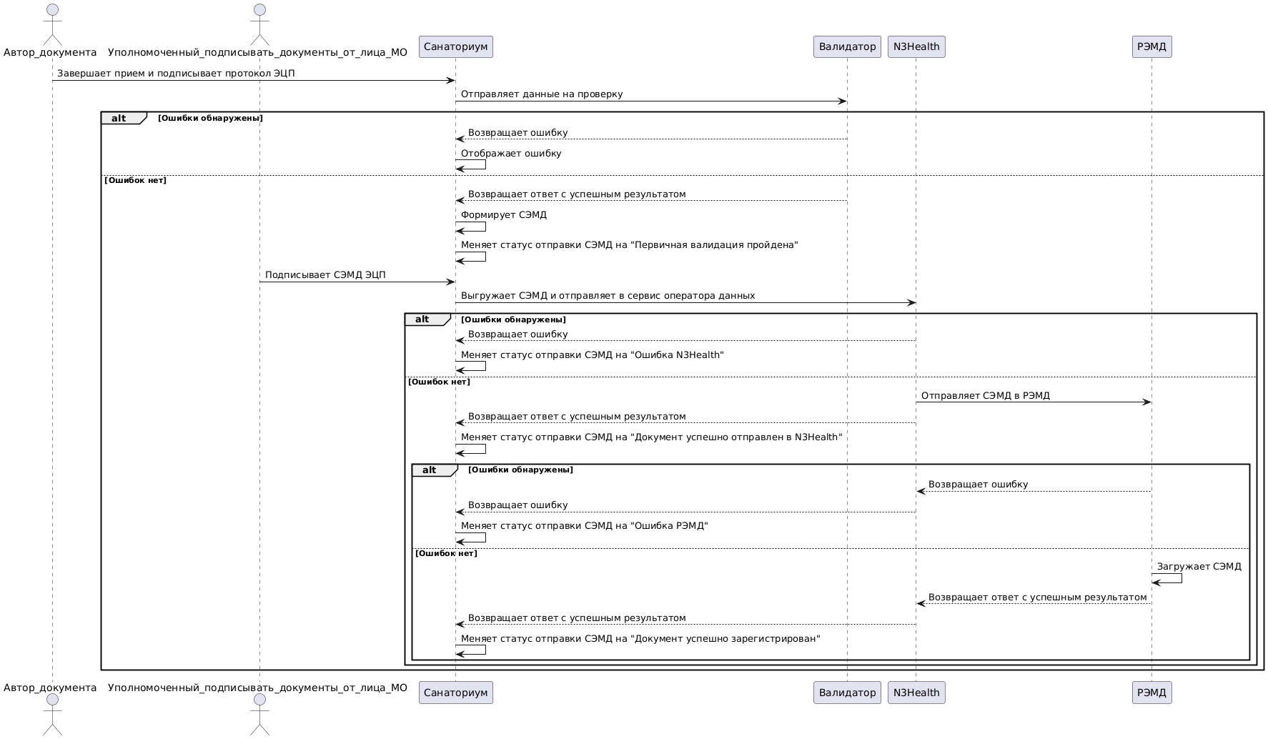 2. Если полученные данные проходят первичную проверку сервисом, то в Санаториум возвращается результат об успешной отправке данных. Далее N3Health передает эти данные в федеральный сервис ИЭМК.