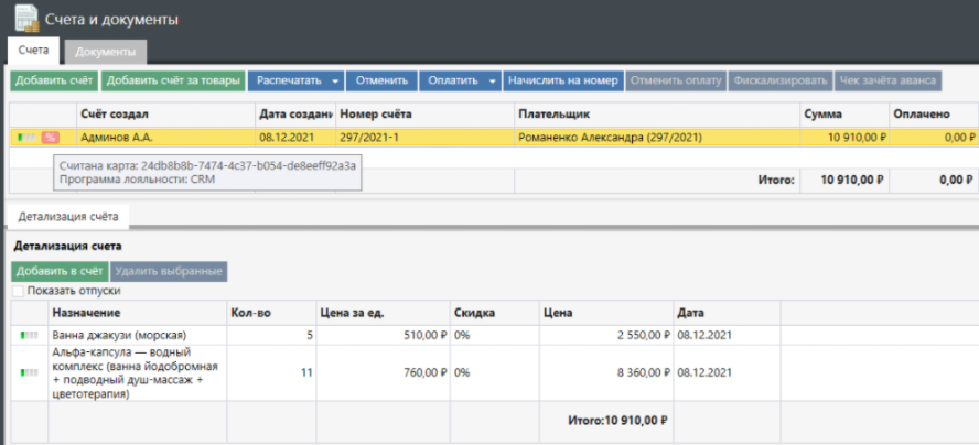 Появилась возможность оплачивать счета с помощью баллов лояльности. Счета “Санаториум” связываются с картами лояльности гостя при создании счета: отображается информация о количестве бонусов и уровню лояльности пациента.