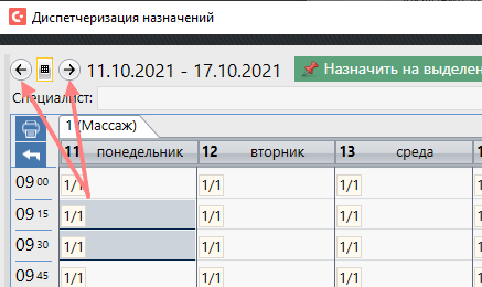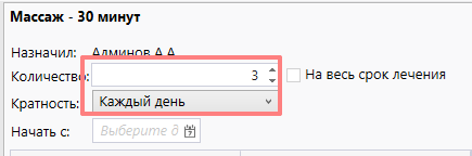 Система диспетчеризует указанное количество согласно указанной кратности. Система с учётом кратности пытается занять выбранное время необходимое количество раз (по количеству назначенных процедур). например, если назначены две ванны с кратностью "через день", и выбрано время 9-30 понедельник, то система попытается занять 9-30 понедельника и 9-30 среды (через день).