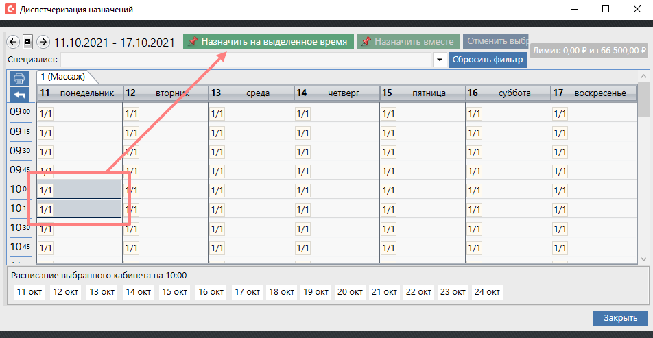 В отображаемом расписании кабинета необходимо выбрать ячейку подходящую по времени и нажать кнопку "Назначить на выделенное время".