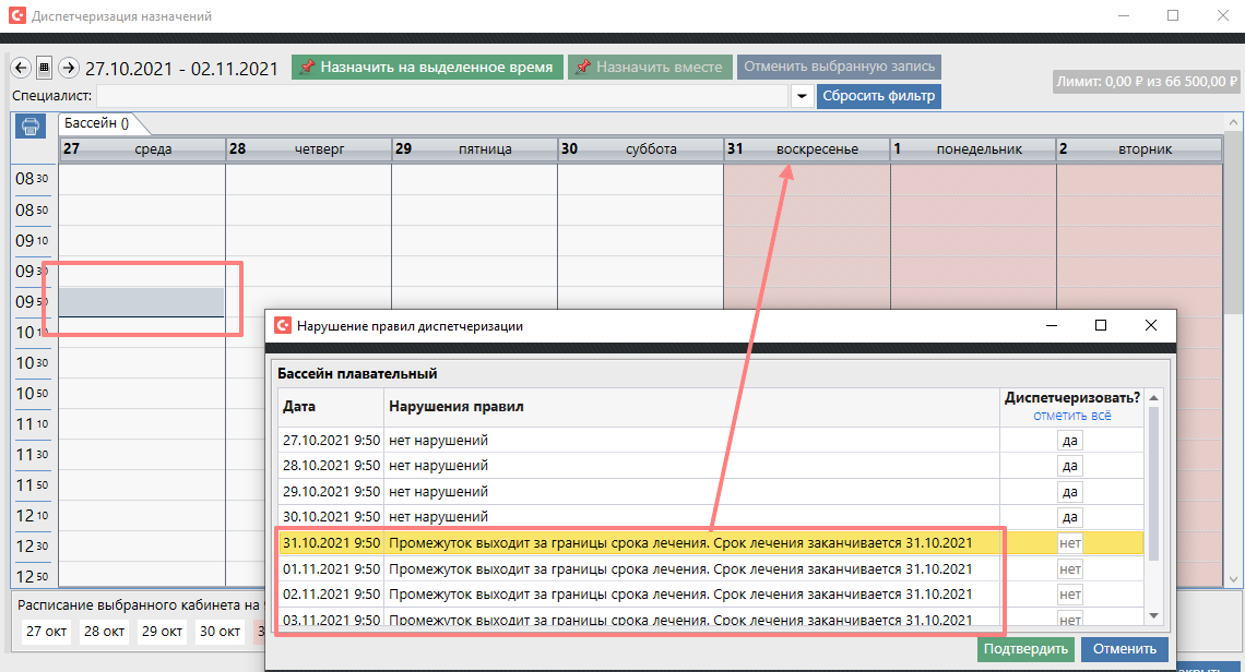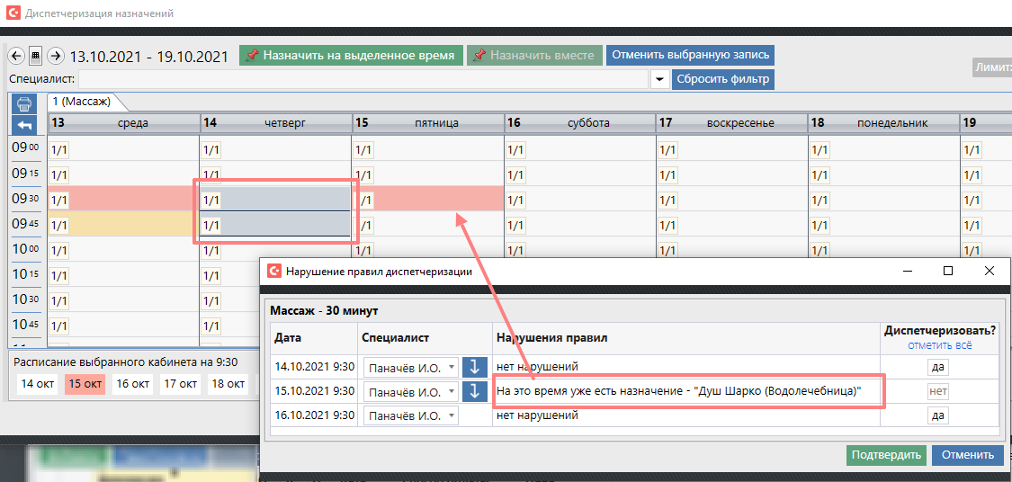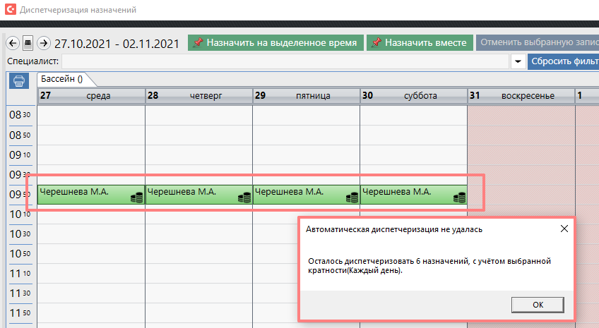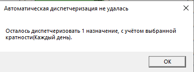 Если система не найдет подходящее время об этом Вам будет выдано сообщение: например мы могли выбрать время 15:00: Если занять время не удаётся так как на один из дней попадает нарушение правил (кабинет закрыт, идёт конфликт с другим назначением) - система занимает сколько сможет и предупреждает о том, что n процедур не диспетчеризовано.