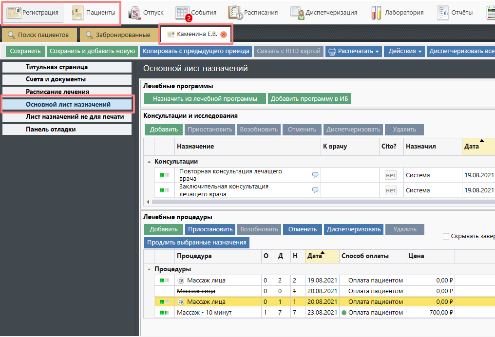 Для диспетчеризации Вы можете находиться в модуле "Пациенты" и в модуле "Регистрация" на вкладках листов назначений Истории болезни пациента или в модуле "Диспетчеризация" в Истории болезни пациента.