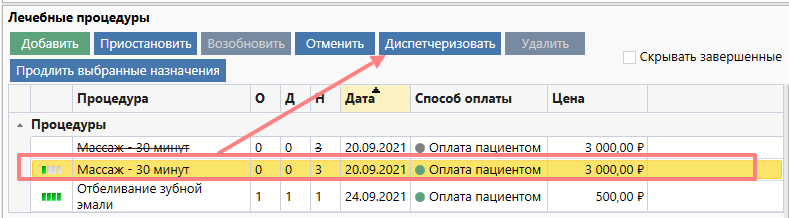Зеленая галочка говорит о том, что услуга полностью диспетчеризована. А 0 из 1 или 2 из 5 говорит нам сколько услуг одного этого назначение уже диспетчеризовано: в нашем случае 0 из 1 - услуга была назначена в количестве 1 и не диспетчеризована, 2 из 5 - услуга была назначена в количестве 5 и было диспетчеризовано всего 2 процедуры из этих 5.