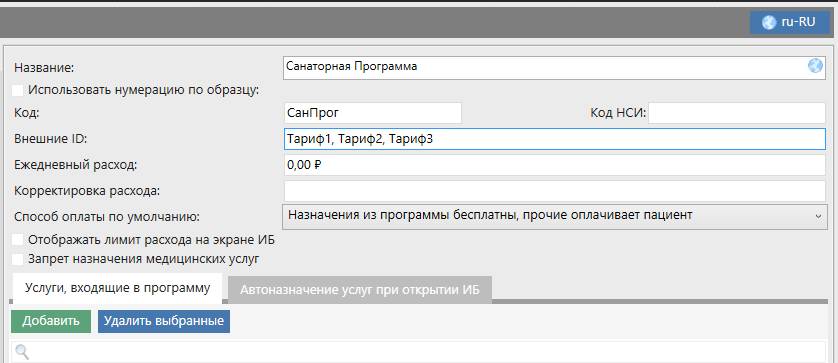 Например, тариф Logus имеет код ТАРИФ, а трек код ТРЕК. В этом случае "Внешний ID" санаторной программы в системе "Санаториум" будет выглядеть ТАРИФТРЕК.