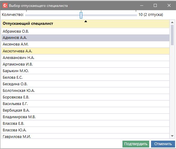"Отпустить на дату" - при нажатии на кнопку появляется окно с выбором отпускающего специалиста и указать дату отпуска.